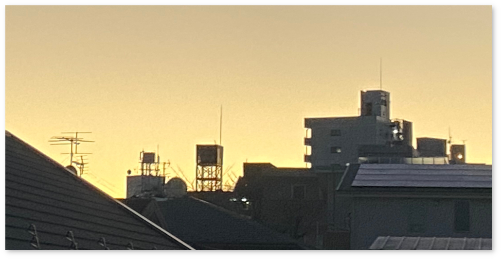 西の空は建物に遮られてあまり良く見えないのだが、隙間に夕焼けが見えた。