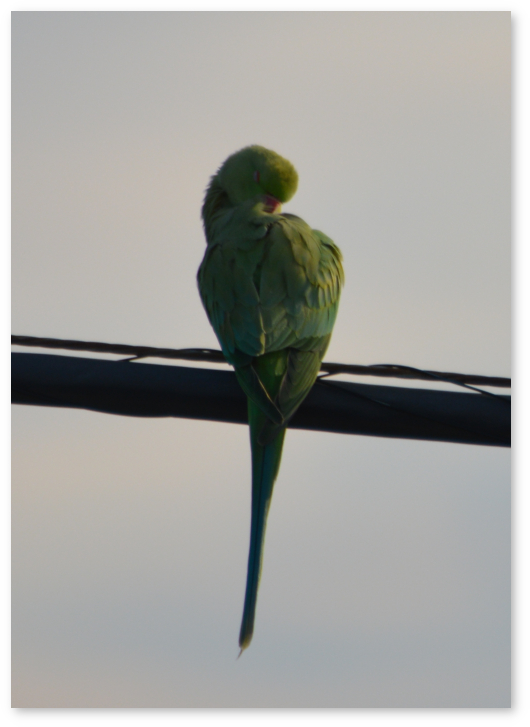 この電線にはワカケホンセイインコ、キジバト、スズメなどがとまる。