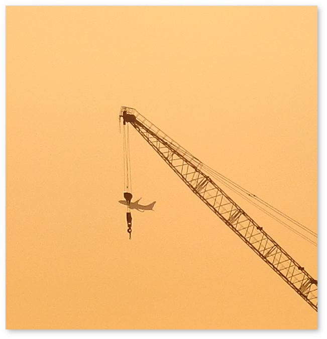 写真を撮ると、偶然クレーンで飛行機を吊っているように見える。