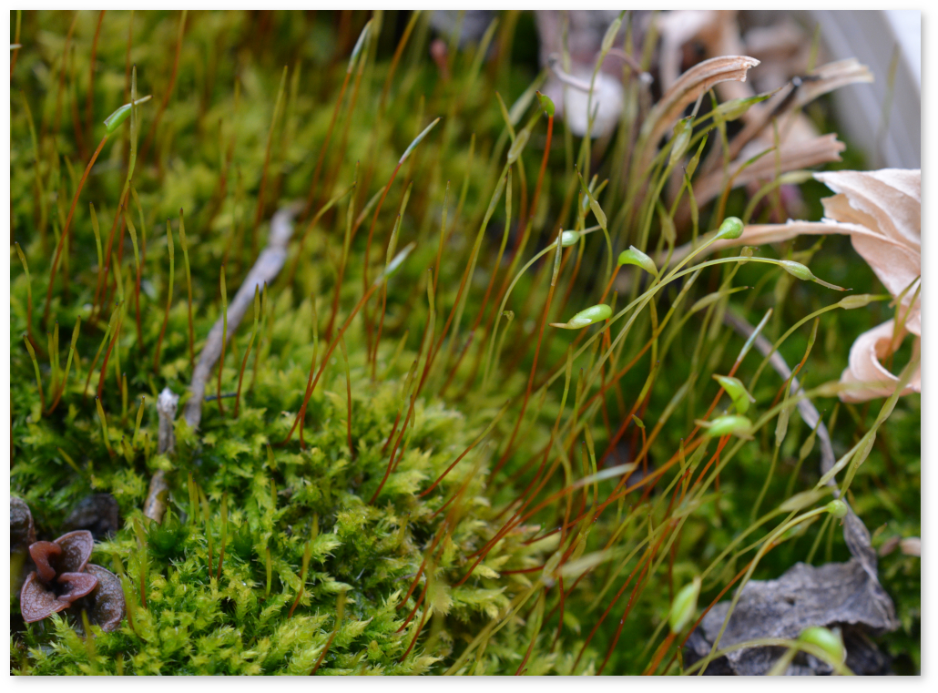 この場合、スギゴケの絨毯のようになっている表面と胞子体の両方にピントが合うといいのだが、そこはマクロレンズではうまくいかない。