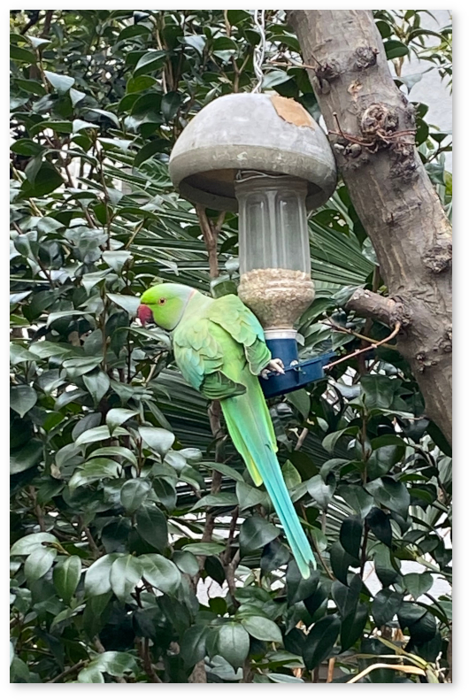 午前は小雨だったので、午後に散歩に出ると、近所でワカケホンセイインコが餌を食べているのを見かけた。
