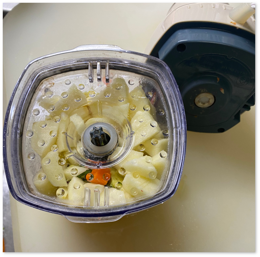 まず材料を包丁で細かく切って、容器に入れるが、多めに入れる傾向がある。写真のジューサーの軸をモーター部分に接続させないと稼働できない。ここが、なかなかはまらなくて時間がかかってしまっていて、なんとか解決法を見つけようとしていた。