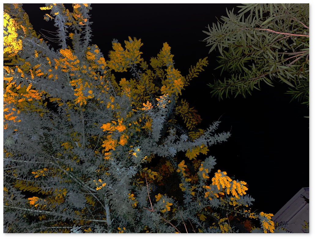 While walking at night, I came to a place with mimosa and suddenly thought about taking a photo. I didn't expect the yellow color to come out well at night, and as expected, it turned out a little blurry. After processing it with the "tone curve," it seems like the yellow became more vivid.