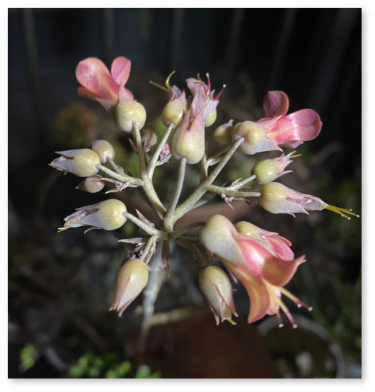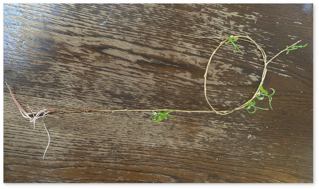 正月で飾りに使った、金色に塗られた枝に芽と根が出てきた。