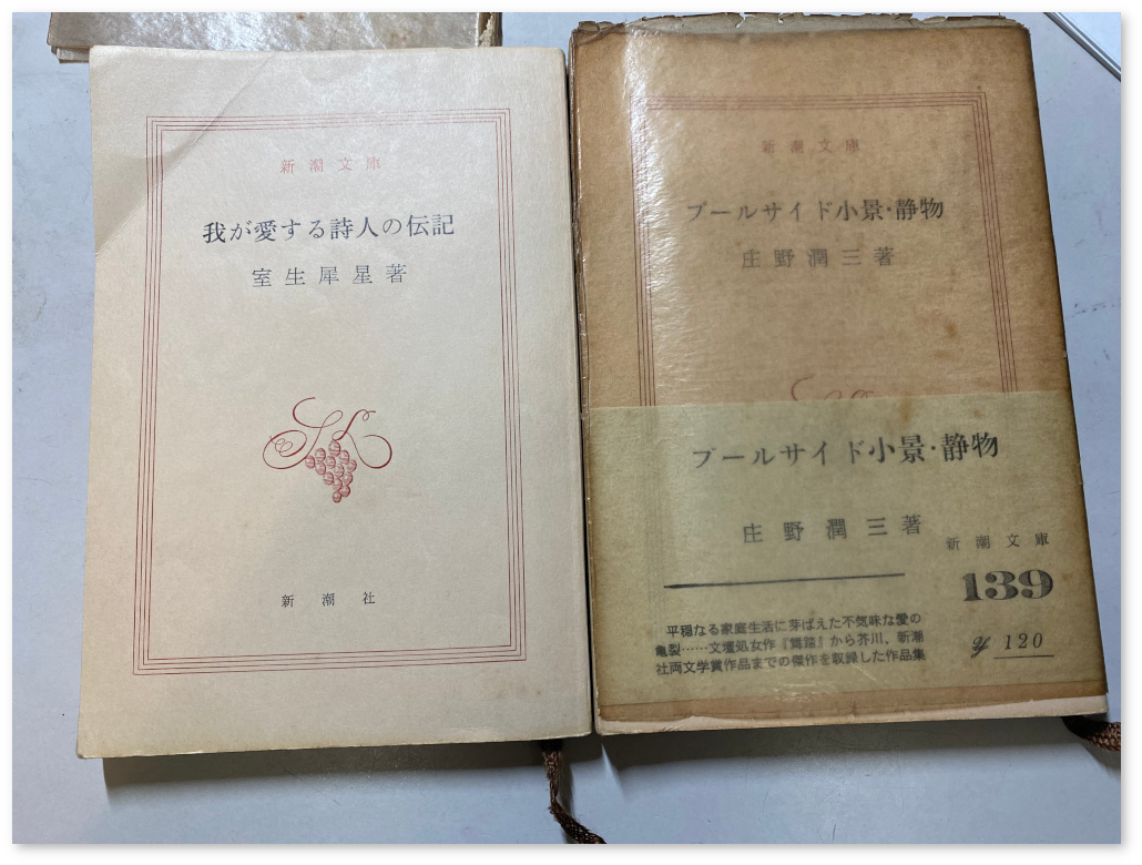 定価110円とか120円のころの新潮文庫。これらは、電子化してパソコンに保存して部屋のスペースを広げる。室生犀星のエッセイや小説は数冊読んで覚えがあるが、懐かしい。庄野潤三も新刊の四六版が平積みされている時代から読んでいたが、どういうわけかこの有名な『プールサイド小景』は内容の記憶がない。読んでいなかったのだろうか。