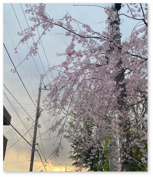 The photo is of the weeping cherry tree in the neighborhood at dusk. It has started to scatter, and the rain at night will scatter it even more.