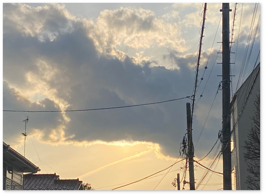 写真は、夕刻の散歩中、西の空の様子。