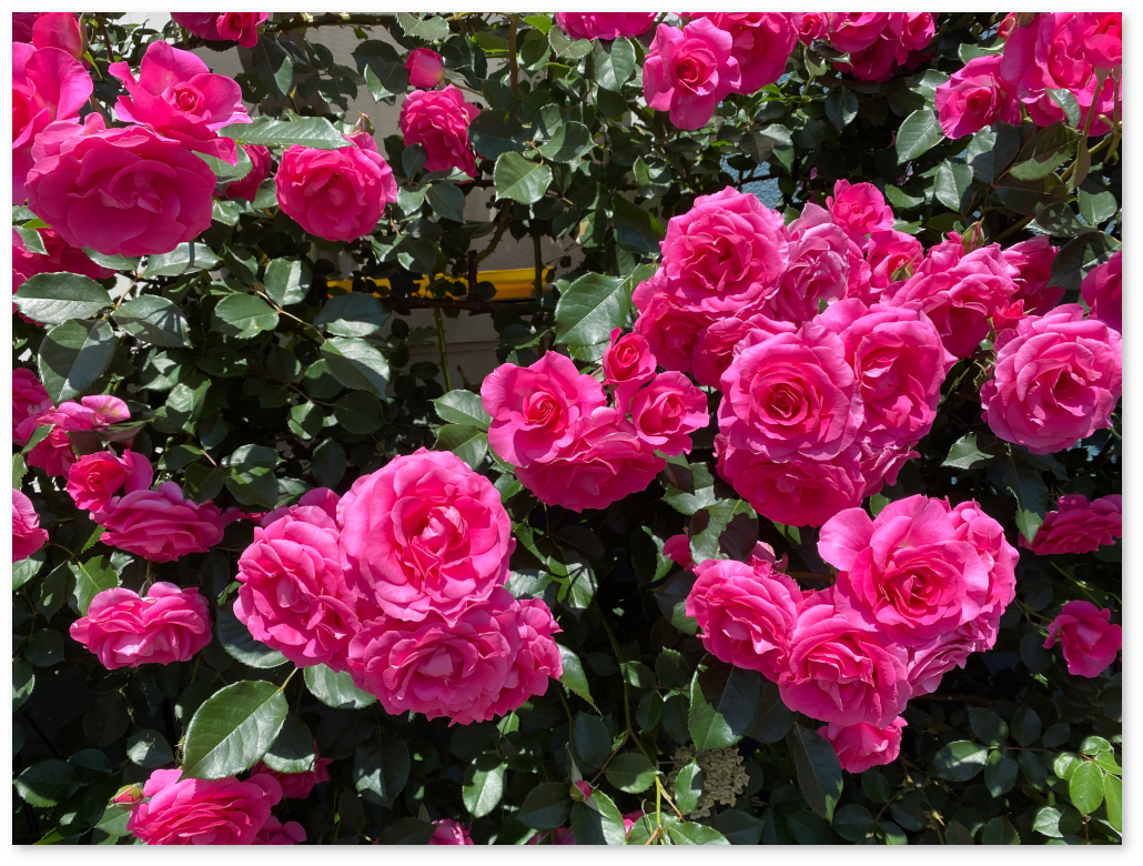 近所でバラが盛んに咲いている。ウチは黄バラだが、さまざまな色の花が満開になっている。