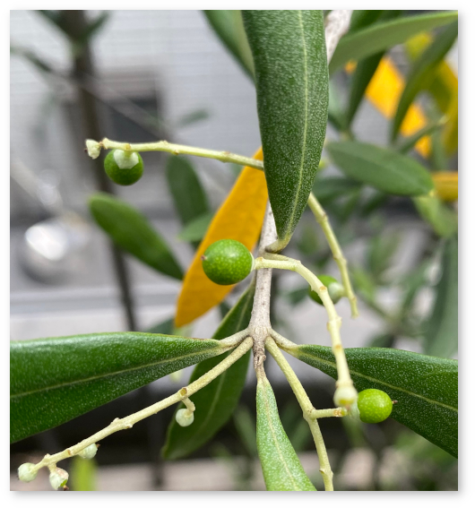たぶん、綿棒で2種類のオリーブの花の中を撫でることで、結実したと思う。今までほうっておいたが結実したことはなかった。