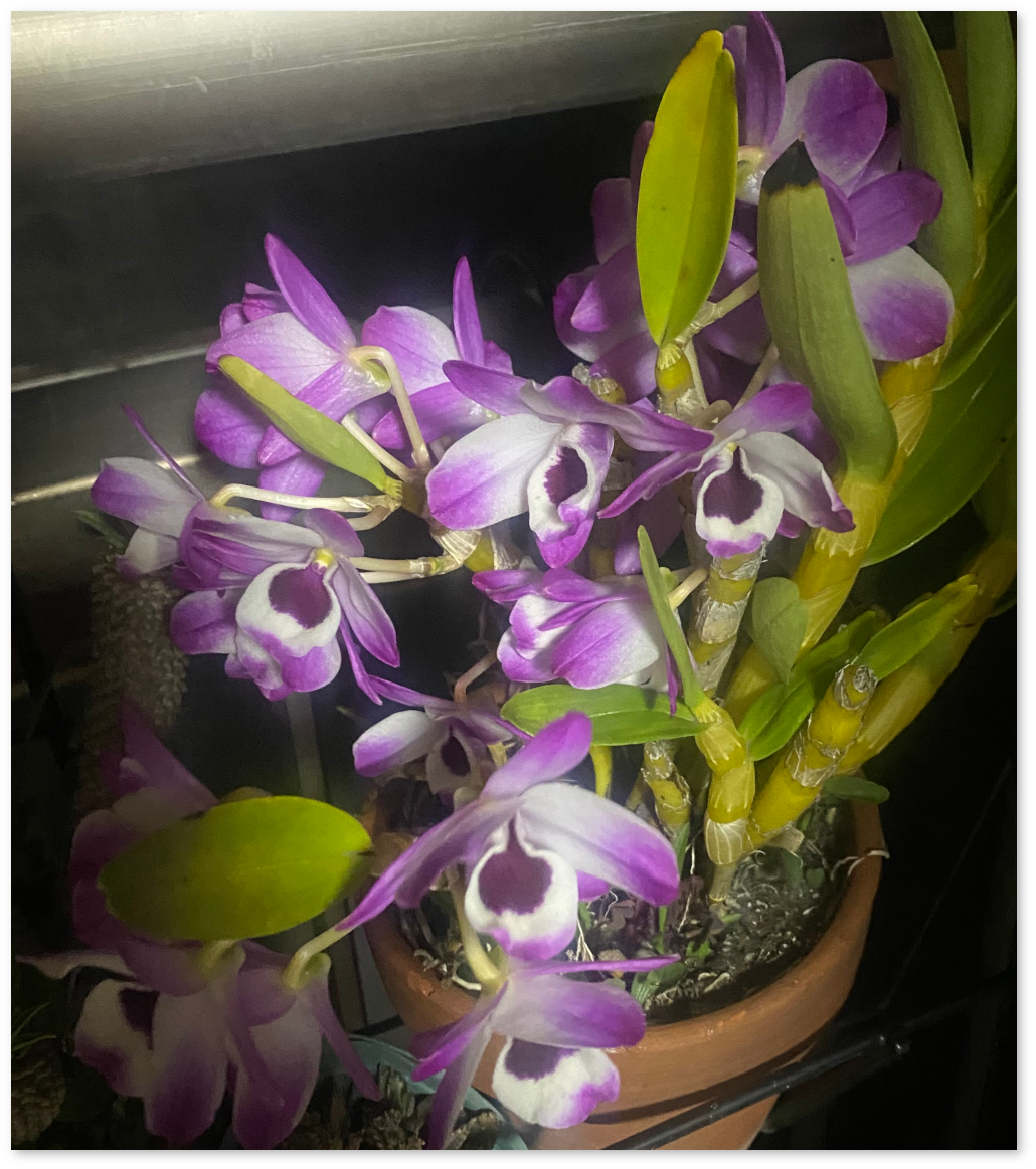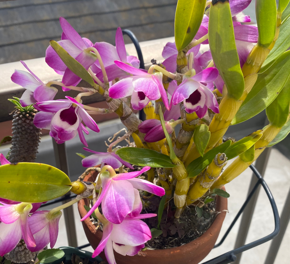 デンドロビウムは3つのプランタや鉢に植えてあるが、そのうちの1つが満開。