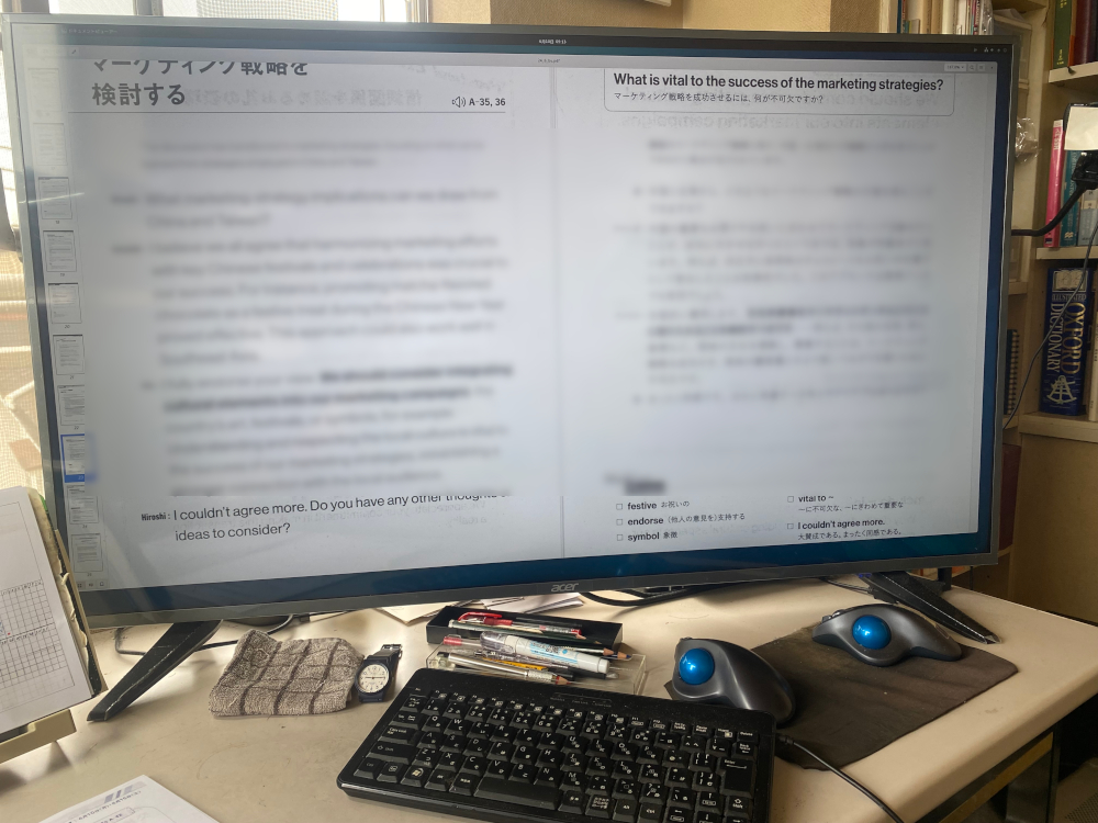 「ラジオビジネス英語」のテキストをPDFにして、拡大表示して学習しているところ。
