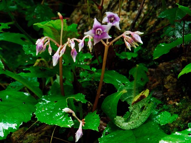 滝のしぶきを浴びてイワタバコは涼しげです。