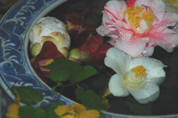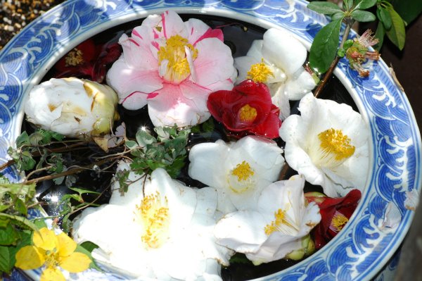 ピンクのが中部「四海波」(これは、もっと大輪になります)それから右回りで、黒侘助、加茂本阿弥、白藪椿、大白冠、袖隠つぼみ、紺侘助。中央が「雪舟」。