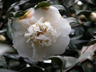 「歴史のある「江戸椿」。花は八重大輪、3〜4月咲き。なお、『草紙洗(草紙洗小町)』というのは能の曲名で、その筋は以下の通り。宮中の歌合(うたあわせ/短歌の優劣を競う遊戯)で、小野小町の相手となった大伴黒主(おおとものくろぬし/小野小町同様、六歌仙のひとり)が、前日に彼女の歌を盗み聞き、『万葉集』の草紙に書き込んでおく。歌合の当日、小野小町の歌は帝から賞賛されるが、大伴黒主は書き込みを入れた草紙を示し、盗作だと非難する。しかし、筆跡を怪しんだ小野小町が草紙を水で洗うと、書き込みは流れ去り濡れ衣は晴れる。ちなみにその時のお題は「水辺の草」で、小野小町が詠んだ歌は「蒔かなくに何を種とて浮草の波のうねうね生ひ茂るらん」