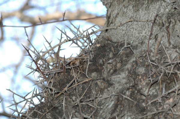 このきは「サイカチ」棘がいっぱいあって、猫も蛇も登れそうもない。種の鞘も20センチくらいあって、今はカラスガ巣をつくっています。