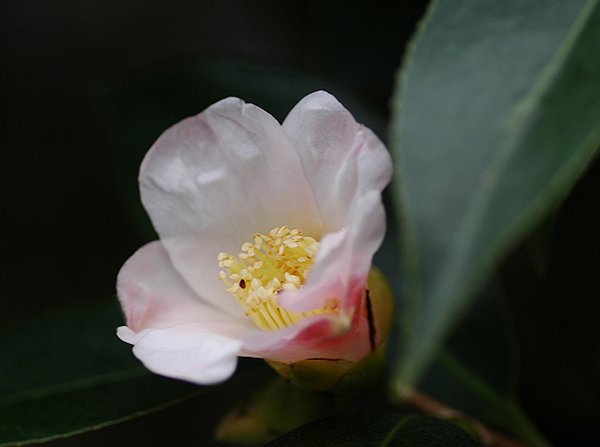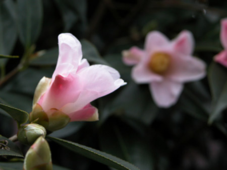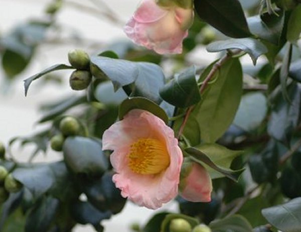 この花の特徴は、普通の侘助より花が開き加減であること。花は、全体にピンクだが、白っぽかったり、薄いピンクであったり緋が入ったりすること。太郎冠者の系列であることです。