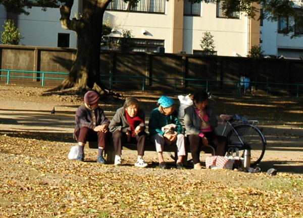 公園でハトに餌をあげて、なごんでるおばさんたちです。