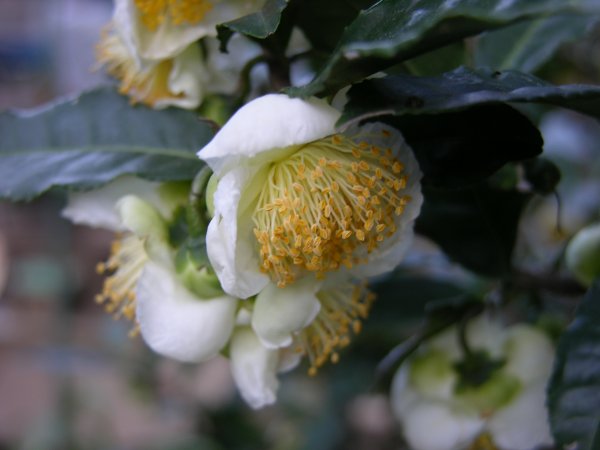 チャの花が咲くと、サザンカまで近い。ここの家の花付きが、妙によくて、ネット越に撮っていたら、三頭も犬がいたのです。最近、犬の置物も流行っていますねー。