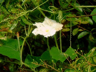 この前の白い花を葉っぱも一緒に写してきました。ウリ科かな?と思っていたのですが、雌花がないようなので、ますます分からなくなりました・・・。