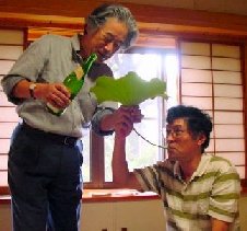 ぜひ皆さんもやって見て下さい。。きれいな蓮の葉と酒を用意します。蓮の葉の中心部分に小さい穴を開け、蓮の葉をくわえて上から酒を注いでもらいます。健康と長寿を願う中国の行事で蓮酒と言います。とぼどぼと勢いよく注ぐと噎せますので注意。