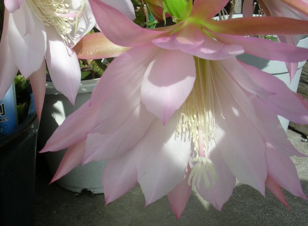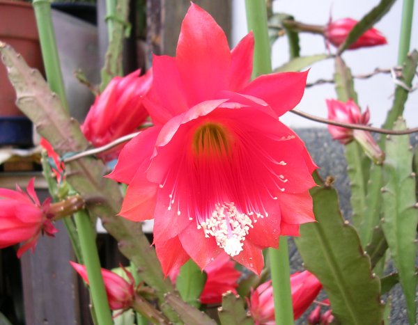 クジャクサボテンの仲間には色違いが随分あるようです。これは30年たっている。月下美人と違い、花は3日くらい持つということでした。赤がもっと鮮やかなのですが・・・。