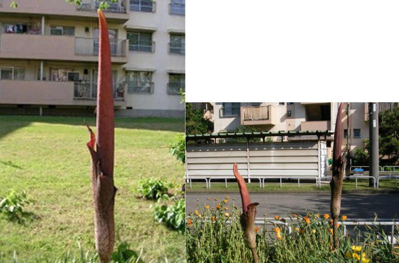 団地の中で写真を撮っていると、前のほうから年輩の方が「あなた、来て。気持ち悪い。へんなのが・・・」とっさに思ったのは「ヤセウツボ」去年の出会いが忘れられません。走っていくと、こんなのが二本立っていました。うわ!きっと「外国産だよね。」「日本のじゃないわよ」「海外のはやっぱり、繊細じゃない」でも、これサトイモ科ですよ。「本とだ!」