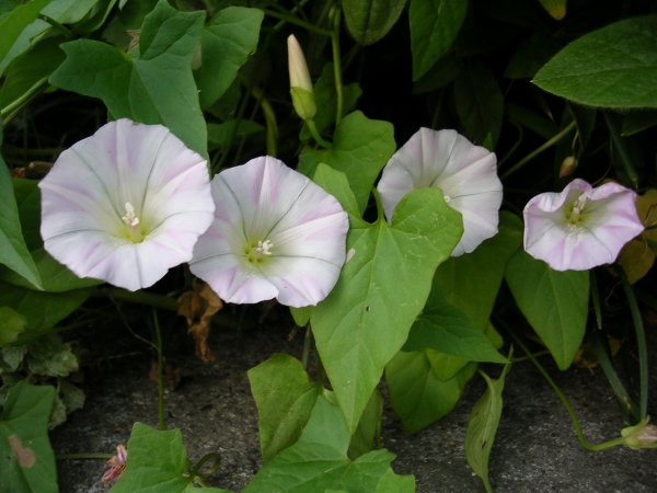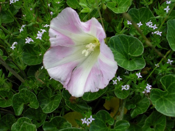 ここは埋められた海岸地帯ですが、もともとの海岸にはハマヒルガオはありませんでした。ナゾです。周囲の小さく白い花はハナヤエムグラです。