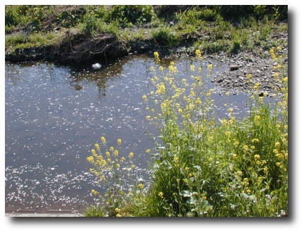 多摩川河畔の菜の花と、水面に浮いた桜の花びらです。