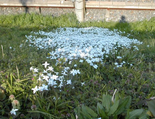 ここの土手は行く筋も、白いハナニラのラインが入っています。種が下へ下へと転がって発根するのでしょう。