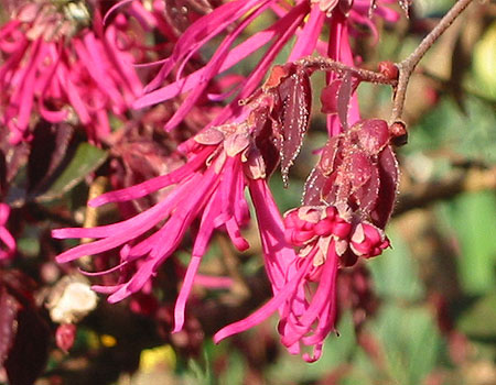 この花はベニバナトキワマンサクです。塀の代わりに植えたりしますが、今は綺麗な時ですね。わたしも先日写真に撮りました。