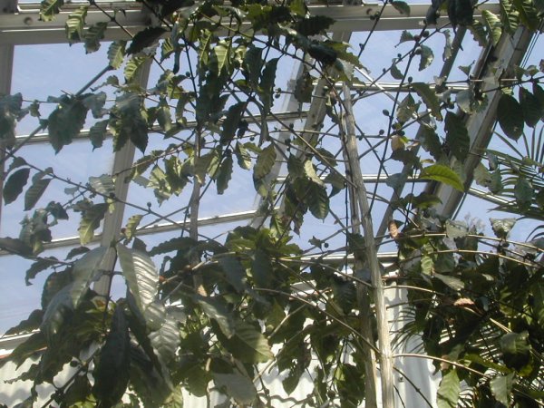 これという宛てもなく見たり撮ったりしていたのですが、温室で20年近く前に見て昨年の夏は蚊の襲撃にあって発見できなかったコーヒーの木に再開。まぁ!この20年なにしてたの?と聞けばたわわなる実が赤に緑になっているのでありました。