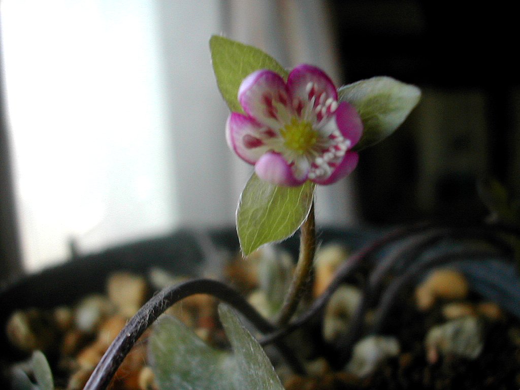 NO.1371の開花したものであれば、葉の特徴がはっきりしていること、花の色合い(私の偏見)からすると、ミスミソウだと思います。