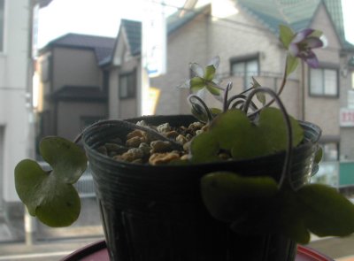 園芸家は「雪割草」という。図鑑ではミスミソウかスハマソウ。ただし両者は見分けにくいということで「雪割草」になったのかも知れない。これは先月500円で買った鉢の、二つ目の花。山野草の世界は深くて、ちょっといかがわしい気がしてしまう。こういう花の八重だとか、色の変化などで儲かったり、枯らして損したりで、万のお金が動くのだそうだ。いかがわしいなんて言ってごめんなさい。