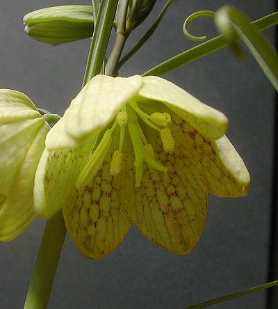 この花は地味すぎて、写真写りがいつも悪い。葉がくるんと巻くのも、花の中の模様が網なのもなかなか伝わらない。(アミガサユリはここからきた名前)