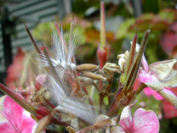 ゼラニウムの種が飛ぶところです。手前の白いのは、ピンボケですが飛びかけています。鞘でフウロソウの仲間だと判りますが、飛び方はタンポポみたい。