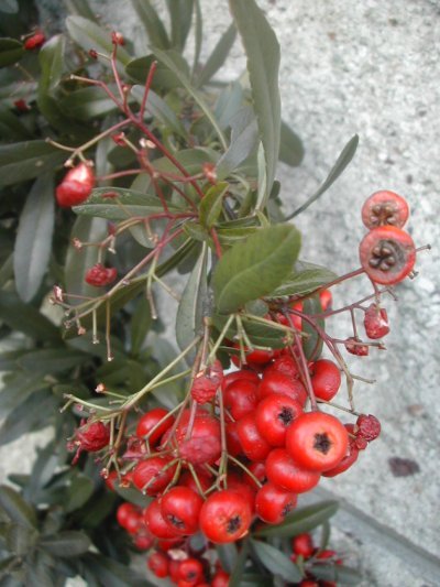 赤いものを指標にして鳥は実を食べる。どういうわけか食べる順があるように思える。柿、みかん、ナンテンは割合早めに食べられる。それから、このピラカンサ。ヒメリンゴなどはまだ食べられていない。結実する時期が違うものもあるけれど、硬いものはなんとなく後回しのような気がする。
