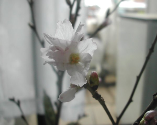 このサクラは例年、花屋の店先に暮れから3月くらいまでに出る。最初は新宿のTOPSでみつけ、次に和風レストランなどに出入りの花屋でみつけた。そこの主は偏屈だったが、花の趣味はわたしと良く似ていた。それからあちこちで売り出したものの、名前は未だにわからない。