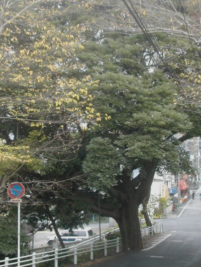 スーパーに行く坂に「保護樹」になっている、タブノキ。大きすぎて何度やっても暗く撮れない。しかもこの樹の又に小さな棕櫚が植わっている。失敗のあげく、葉の少なくなった冬に遠めで撮りました。御神木になっていたりするけど、すばらしい大きさです。