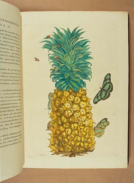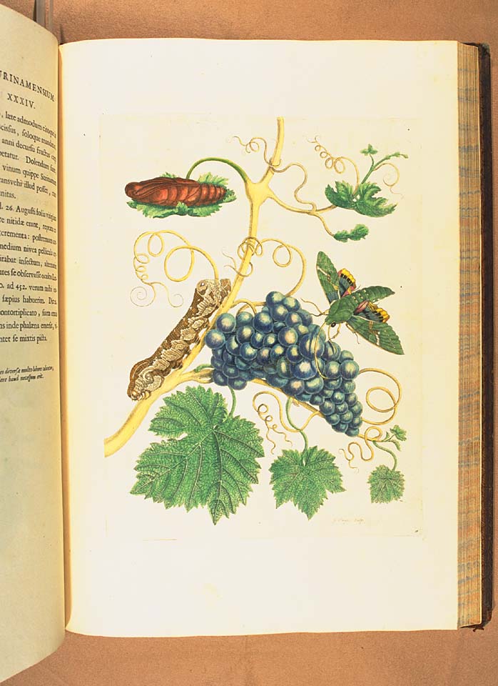 「南米北部スリナムの昆虫と、その餌になる植物を描いた手彩色銅版画図譜。蝶や蛾を中心とした昆虫の幼虫・蛹・成虫の三段階を植物と同一画面上に描いた点に特徴がある。メーリアンはスイス人を父、オランダ人を母としてドイツで生まれ、オランダで活躍した女性昆虫・植物画家。」