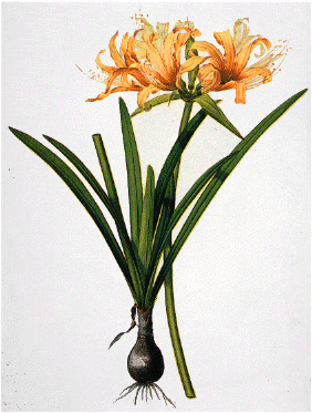「ルドゥーテ『ユリ譜』。ルドゥーテの代表作中の代表作といわれる。ルドゥーテは別に『バラ譜』(Les roses, 1817-24)を描いたが、双子葉植物のバラに対し、本書は単子葉植物の図譜で、ユリに限らず、アマリリスやアイリス、蘭なども描かれており、全部で488図ある。彩色の点刻彫版で第372図のみ無彩色。ジョセフィーヌのマルメゾンの館で、最も華やかに生活していた頃の仕事。」