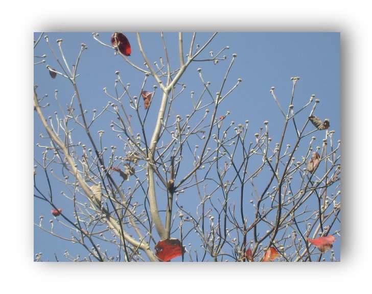 赤い葉がおちて裸木。でも、先には芽が。