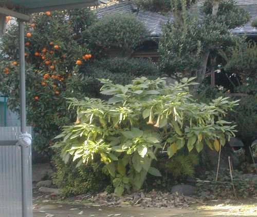 猛毒のダチュラは、流行っているのか。本日二本目。しかし、こちらの方が大きい。農家の前庭、みかんもなっている。農家らしきところは、平屋が多い。