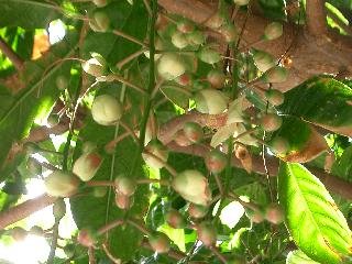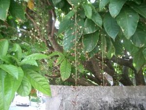 フクギの木は海辺の近くのシマ(村)では防風林として植えられています。あの写真はサガリバナの家の近くの街路樹として最近植えられたものです。那覇の国際通りのすぐ近くです。分厚いしっかりとした葉っぱがきれいです。沖縄本島の北部の備瀬のフクギはとても立派です。木の幹だったと思うけど、芭蕉布とかの染料として使われています。為丸さん情報としては実は食べられるということですが、拾っている人を見たことがありません。落下して腐っていきます。サガリバナは薩摩が出した「質問本草」では「玉蘂(ぎょくずい)」とあります。中国ではこういうらしい。