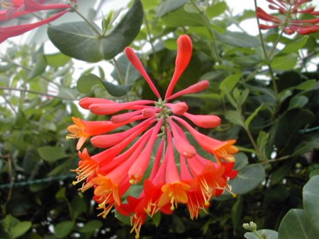 花に近い1〜2対の葉が合着して、いかにも葉を貫いて茎が出ているように見えるのでツキヌキニンドウという名前になっています。寒さから遁れられれば、マンションの垣根なんかにもなります。(coral)honeysuckleというのがスイカズラのことなのでしょうが、洋食器などのテーマやウィリアムモリスのラッピングペーパーにもあるように身近な存在だったのでしょう。挿し木ですぐに増えるそうです。