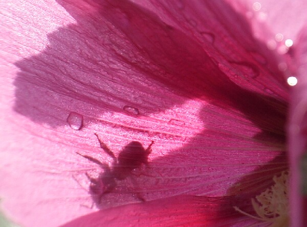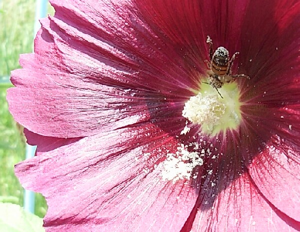 立葵の花びらの裏にかくれた蜜蜂です。