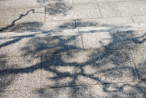 お寺の階段を下りていたら、墨絵のように松の影が映りました。
