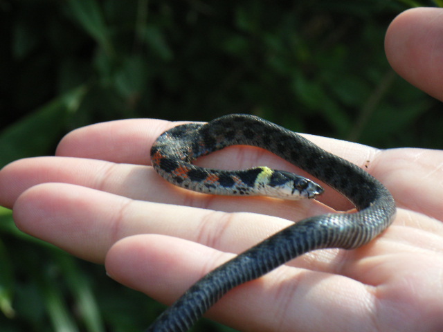 ヤマカガシのこども。首に黄色の斑点。