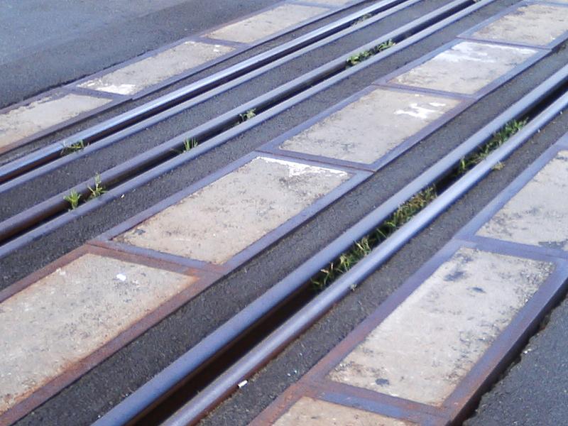 この踏み切りの特徴、新幹線の広軌用のレールと在来線の狭軌用のレールが並んでいます。