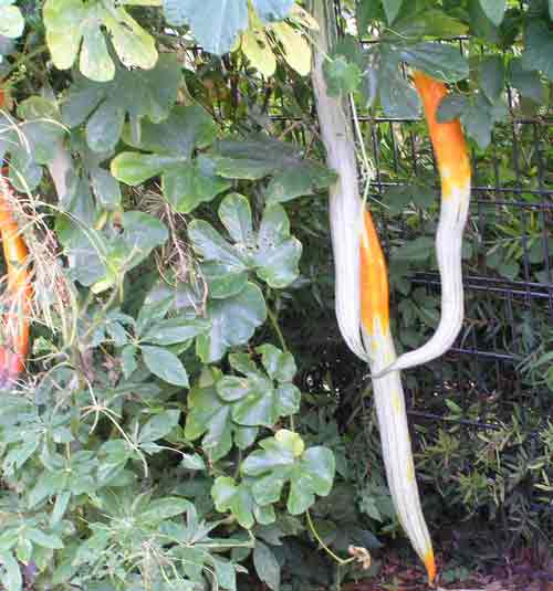 ヘビウリ、妙に長い瓜です。インド原産、明治に渡来したような。食べてもマズイので食用にはならないようです。