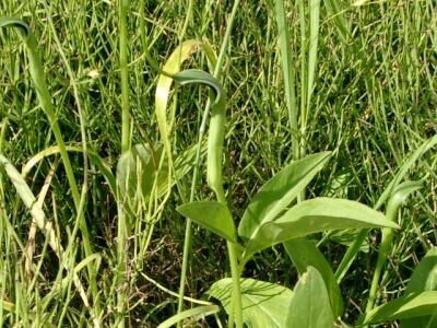 ペコさん図鑑で確認しました。オオハンゲは葉が丸くて大きいです。カラスビシャクは細長いようですが。